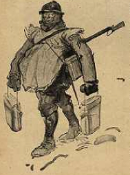 « Ah là là! qu’est-ce que je trimballe: couverture roulée dans ma toile de tente et mon mousqueton en sautoir, mes cartouchières bien remplies… pour l’usage externe, mon bidon de pinard aussi… pour l’usage interne! »