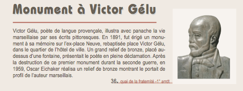 Sa statue (celle dont parle César dans Marius), édifiée sur le vieux port en 1891 au dessus d’une fontaine, fut détruite en 1943 par l’occupant allemand en quête de bronze…
