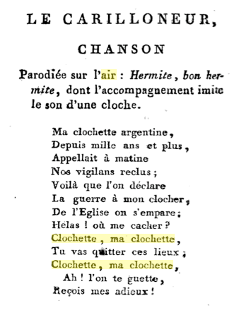 Et voici la musique, qu’il ne fut pas une mince affaire de trouver. En effet l’air indiqué « clochette, ma clochette », renvoie à un air antérieur « hermite, bon hermite »
