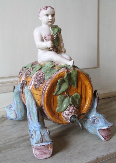 « Le thème de Bacchus juché sur un tonneau est fréquent en céramique mais il est généralement traité d’une façon bouffonne. Ici, rien de tel, les proportions demeurent harmonieuses ; la douceur de la polychromie de grand feu, l’allongement des dauphins jaspés qui soutiennent le tonneau, le maintien grave et un peu solennel de l’enfant Bacchus tenant une coupe, comme un hommage rendu au vin, participent à la grâce de cette fontaine à vin à laquelle nous ne retirons rien de notre admiration«