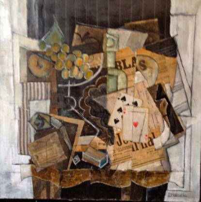 Voici une oeuvre de sa période cubiste. Qui dira par quels mystérieux chemins de l’inconscient se trouvent réunis là cette grappe de raisin à ces gazettes, cartes à jouer et autres objets hétéroclites ?