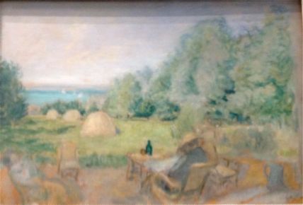 Comme on envie cette paisible pause devant les meules de foin au jardin des étincelles, à Criqueboeuf de Vuillard (1902).