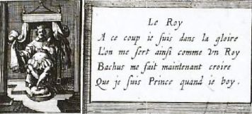 Cette planche (que l’on peut trouver sur gallica) mérite qu’on la regarde de plus près. Ils sont là vingt-quatre, du Roy au Portier, du Sommelier au Laquais, à proclamer leur bachique addiction. Chacun y va de son épigramme. Voici, à tout seigneur tout honneur,