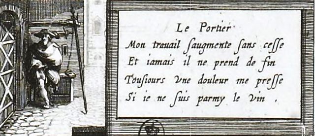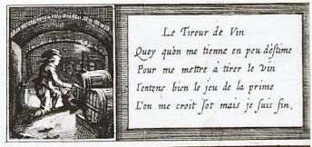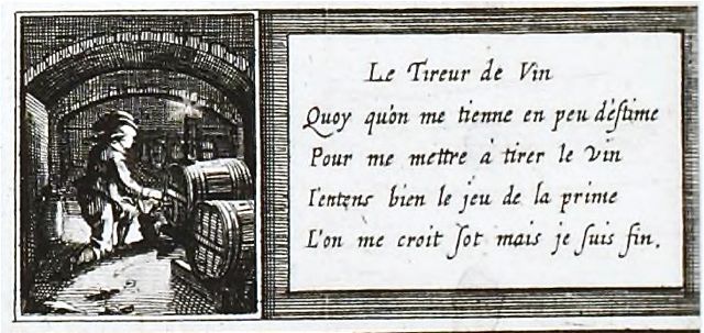 Le Tireur de vin : » Quoiqu’on me tienne en peut d’estime Pour me mettre à tirer le vin J’entends bien le jeu de la prime L’on me croit sot mais je suis fin »