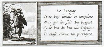 Le Laquais « Je ne vais jamais en campagne Alors que l’on fait un banquet Ai-je bu du bon vin d’Espagne Je cause comme un perroquet »