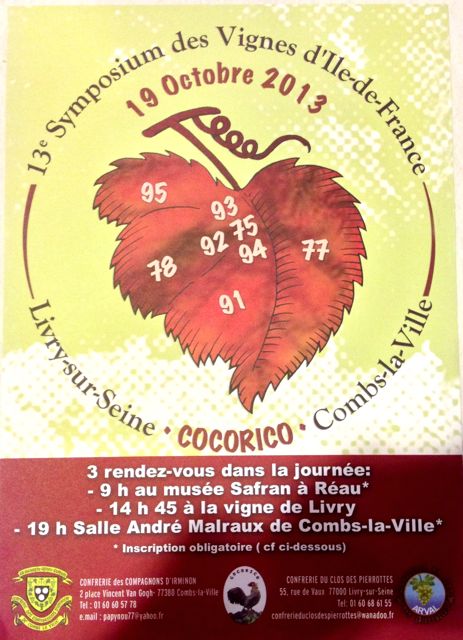 L’association Cocorico (Comité de Coordination de la Région Ile de France des Confréries) organise tous les deux ans (en principe) un Symposium des vignes d’Ile de France. Cette année, ce sont les Confréries du Clos des Pierrottes (Livry/Seine) et celle des Compagnons d’Irminon (Combs-la-Ville) qui étaient à la manoeuvre.
