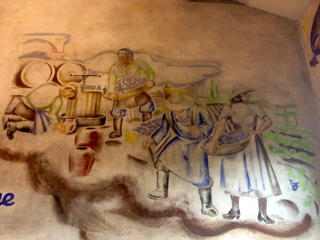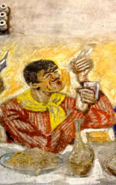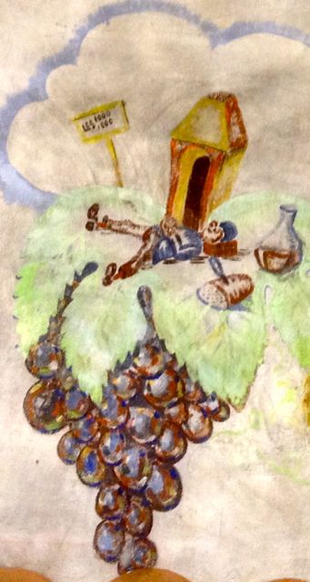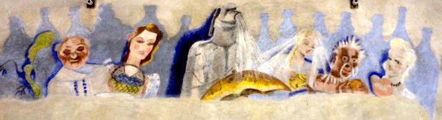 Cette peinture laisse perplexe : personnages de carnaval (noter le panier de raisin), au centre une bouteille d’eau de Seltz, au fond les ombres de bouteilles…