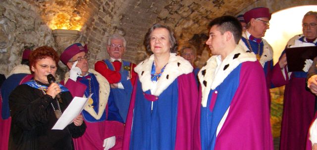 La cérémonie qui suivit permis à quelques élus d’être intronisés dans la Confrérie, comme les chanteurs Isabelle (du Souffle de Bacchus), reçue ici par sa chef de choeur, et Arnaud,