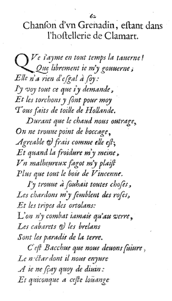 Mais ceste bande lasse de danser, mérite bien que l’hostellerie de Clamart leur soit ouverte, qu’ils y soient receuz, qu’on les repaisse, qu’ils se reposent, & le tout à crédit ; attendant le passe-port de leurs Majestez pour aller ailleurs : Aussi sont-ils benignement rencontrez par l’hoste & l’hostesse de Clamart,