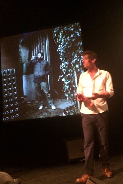 Le spectacle commence, ou ne commence pas. En tout cas Sébastien Barrier commence à parler. Il n’arrêtera plus. C’est un conteur intarissable. On comprend assez vite que son propos est une ode aux vins naturels, à ce pays, la Loire, où ils sont produits (et quel nul n’est censé ignorer …), à ces hommes et femmes qui le font, qu’il a rencontrés, qui sont devenus ses amis, qui lui ont tout dit d’eux et dont il nous dit tout, à son tour. Mais pas que, car les digressions sont nombreuses. D’ailleurs, une digression, à partir du moment où elle nous éloigne du sujet pour y revenir, n’est-elle pas une autre façon de le considérer ? On saura donc tout aussi de l’itinéraire de Sébastien, de sa passion pour le conte de rue, de sa participation au festival de l’art de la parole à Rennes, de sa Bretagne, et de son futur boulot : maire de Brest ! Il cite Perros, Jule Chauvet et son esthétique du vin (note ça Jérémie)… Mais tout celà n’est qu’une introduction.
