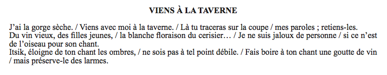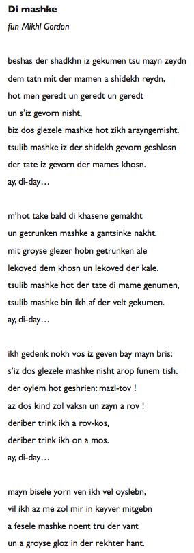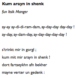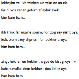 Viens (boire un p’tit coup) à la taverne, pourrait-on traduire. C’est le titre d’une chanson entendue à la Maison de la Culture Yiddish au cours d’un shabes-tish très laïque (repas du vendredi soir qui marque traditionnellement le début du repos hebdomadaire) consacré aux chansons à boire.