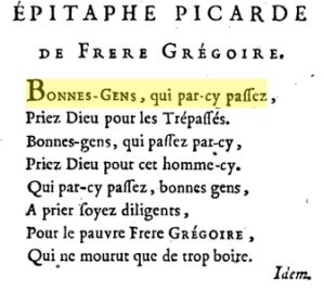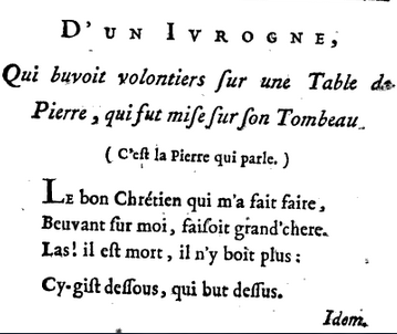En voici quelques unes, trouvées dans le Recueil d’épitaphes sérieuses, badines, satiriques et burlesques de M. De La Place (Bruxelles, 1782). Elles concernent des buveurs, bien entendu ! Il ya là tout un concentré de vie !