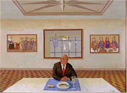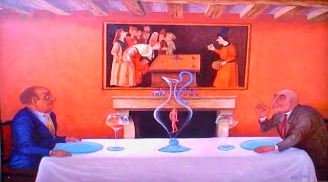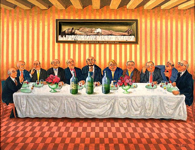Cette Cène aux trois jeroboams (à moins que ce ne soit des mathusalems) n’est pas très académique : ils sont onze, et le message au-dessus dit en latin : bois, mange, jouis de la vie, bientôt tu seras sous terre !