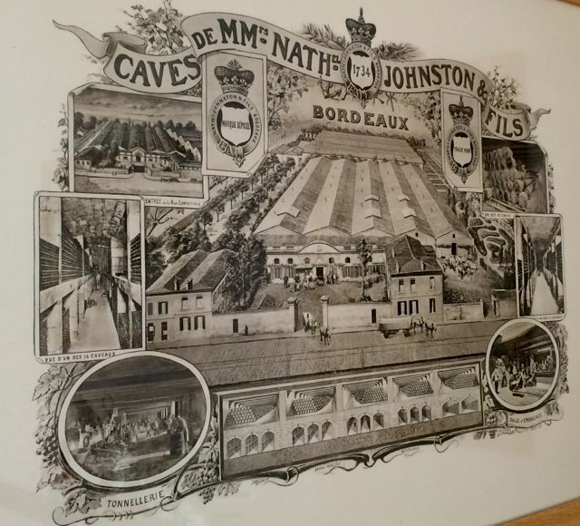 Voici une affiche présentant les caves bordelaises Nathaniel Johnston, fondées en 1734 par un descendant d’écossais ; la maison existe toujours, même si elle a dû quitter le quai des chartrons en 2003..