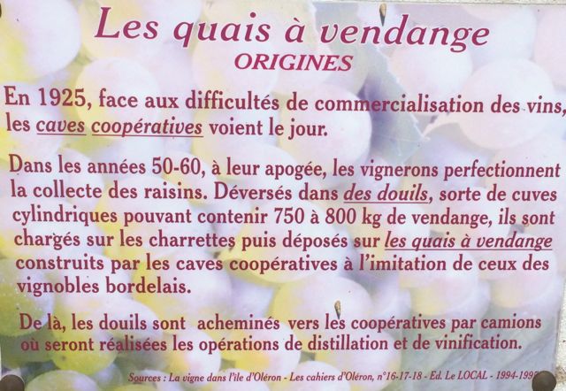 Parcourant l‘ile d’Oléron en deux-roues avec l’ami Gérard, nous avons pu observé les quais à vendanges où sont déposés les douils pleins de raisins avant leur évacuation par camion.