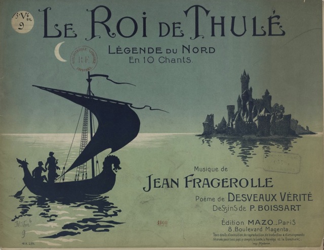 Nous avons déjà croisé la route du roi de Thulé et de sa coupe, lors d’un concert au Musée de Cluny il y a une paire d’ans. Nous l’empruntons à nouveau, étant tombés par hasard sur une Légende du Nord en 10 chants, intitulée Le Roi de Thulé (musique de Jean Fragerolle, Poème de Desveaux Vérité) qui doit dater de 1908,