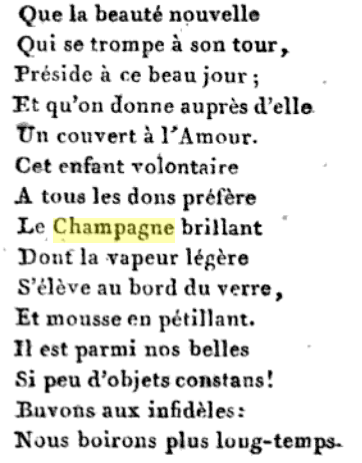 Plus explicite est cet air à boire chanté dans « the man of mode » de George Etheredge qui date de 1676, louant le « sparkling champaign » qui remet rapidement sur pied les amants languissants, nous rend espiègles et gais et noie toute peine…