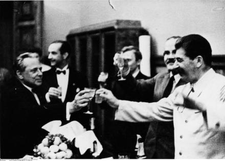 From left, German Nazi Foreign Minister Joachim Von Ribbentrop, German Under State Secretary Friedrich Gaus, Soviet head of state Joseph Stalin, and his Foreign Minister Vyacheslav Molotov pose in 1939 at the Kremlin after signing the Soviet-German Non-Aggression Pact. After the ceremony, Stalin proposed a toast: “I know how much the German people love their Fuehrer. I should therefore like to drink to his health.”