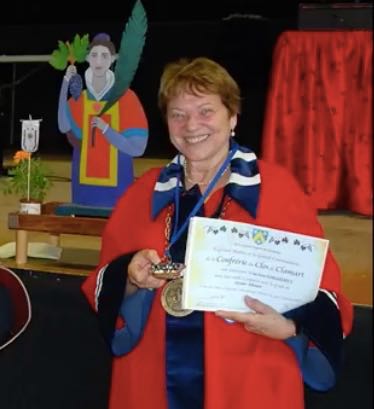 une impétrante ravie devant le saint vincent de la confrérie