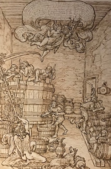 Dans cette scène de foulage, on voit le jeune Focus s’abreuvant au chalumeau du vin d’un tonneau