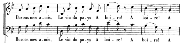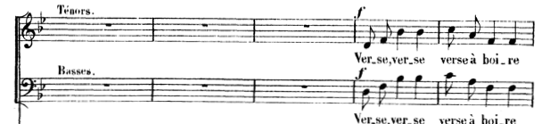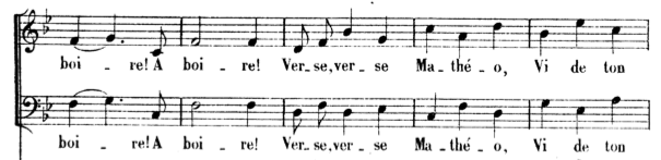 Mais il nous intéressera ici pour ses airs à boire, au 1er acte « la vendange est terminée » et au 3ème acte « verse, verse à boire »