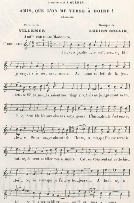 Terminons avec Amis, que l’on me verse à boire, chanson d ‘un amant abandonné (Villemer et Collin,1877)…