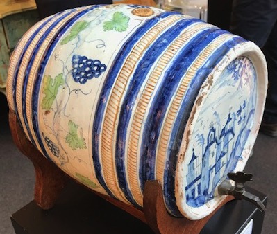 On ne pouvait pas ignorer ce tonnelet en porcelaine du 16-17ème présenté par Blanc et Bleu Antiquités (J.M.Vivona). Avec son robinet et son bouchon il est prêt à l’emploi !