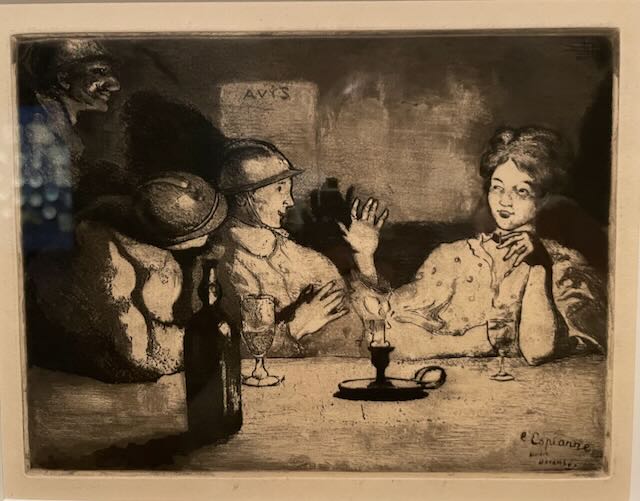 Cette eau-forte met en scène deux soldats buvant un coup avec une « espionne » (titre de l’oeuvre) pendant la guerre de 14.