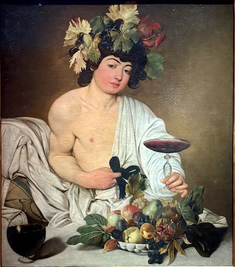 Plus ancien, le Bacchus de Caravaggio (fin 16ème) est archiconnu, » Carpe Diem » semble-t-il nous dire coupe en main.