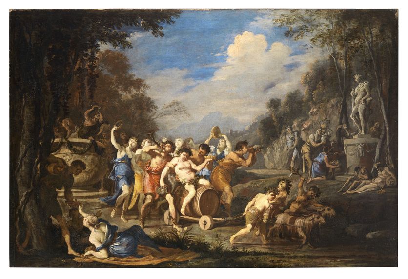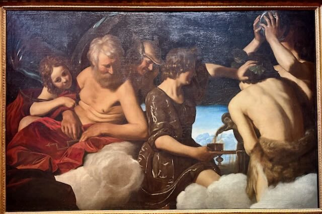 Le banquet des dieux du romain Spadarino (vers 1625) : au centre Ganymède tient un plateau avec une coupe que Bacchus (de dos) remplit ; en haut à droite quelqu’un boit déjà…
