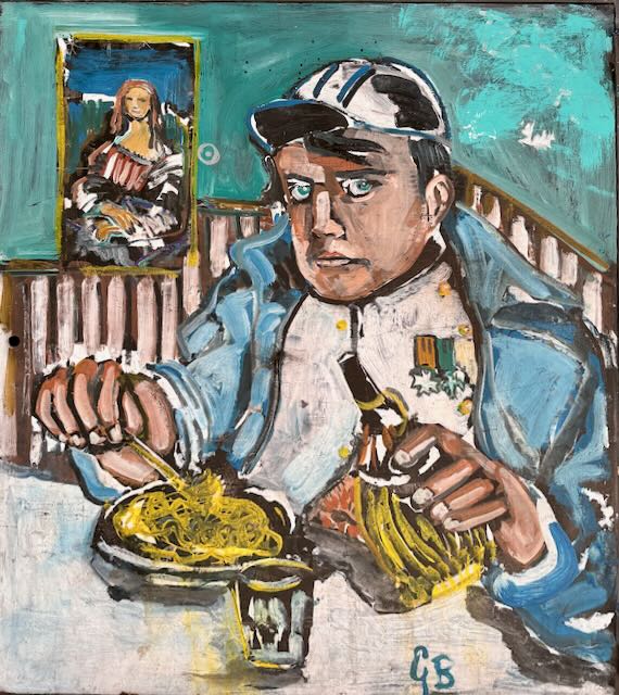 Produit du street art, ce tableau peint sur un mur nous a frappé par tout ce qu’il exprime : le « petit caporal », la campagne d’Italie, l’expression volontaire, déterminée d’un que rien n’arrête, la pasta et la bottiglia di vino, et sous sa garde la Joconde qui veille aussi sur lui… C’est du grand « street art » signé GB. Qui est donc ce GB ?
