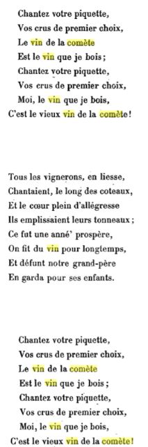 Le vin produit cette année-là, était d’une telle qualité et quantité qu’il resta dans l’Histoire comme le « vin de la Comète ». Il est vrai que l’été et l’automne avaient été anormalement chauds. C’est ainsi qu’un dégustateur en septembre 1986 d’un Yquem 1811parled’un vin dépassant tous les superlatifs et ne pouvant être approché et comparé que par le renommé millésime 1847.