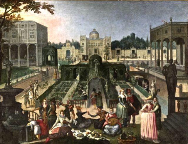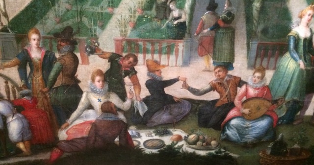 Populaires en Flandres aux 17ème siècle, on s’y retrouvait pour composer poèmes et chants, débattre et philosopher, boire et faire la fête. On nous y fait remarquer Calvin, Luther qui joue du luth, des représentants de diverses confessions reconnaissables à leur costume.