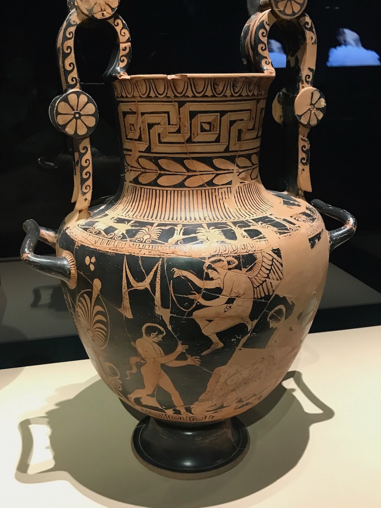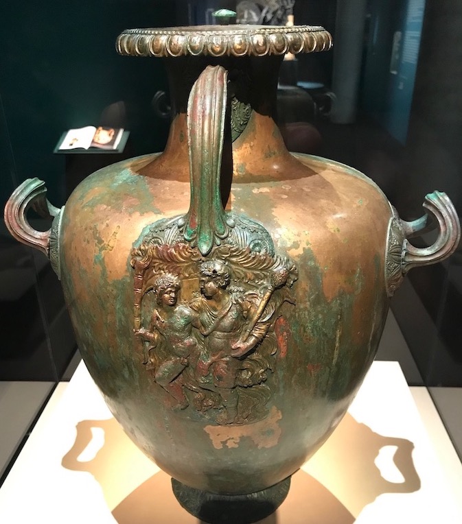 Le thème de la mort est là évidemment, avec cette hydrie funéraire en bronze dorée (Grèce, fin du 4ème siècle avant JC) qui représente Dionysos et son amant Ampélos, « dont la mort prématurée causée par un taureau laissa le dieu inconsolable », et qui se serait métamorphosé en vigne.