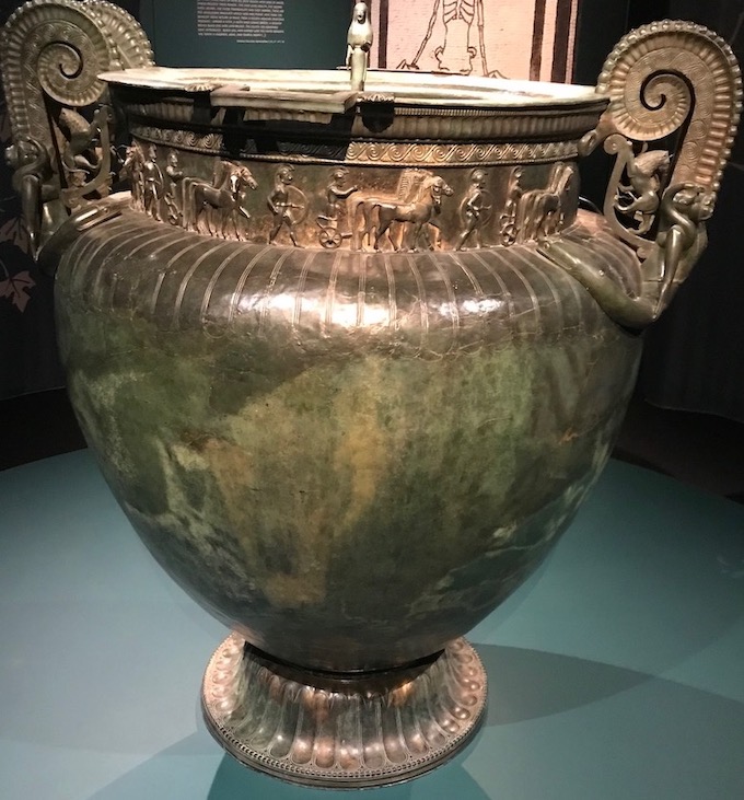 Plus monumental encore est ce cratère découvert à Vix dans la tombe d’une princesse celte (fin du VIème siècle av. J.C.), qui témoigne des échanges existant alors entre Bourgogne et Italie. C’est le plus grand vase que l’Antiquité nous ait légué, il pouvait contenir 1100 litres.
