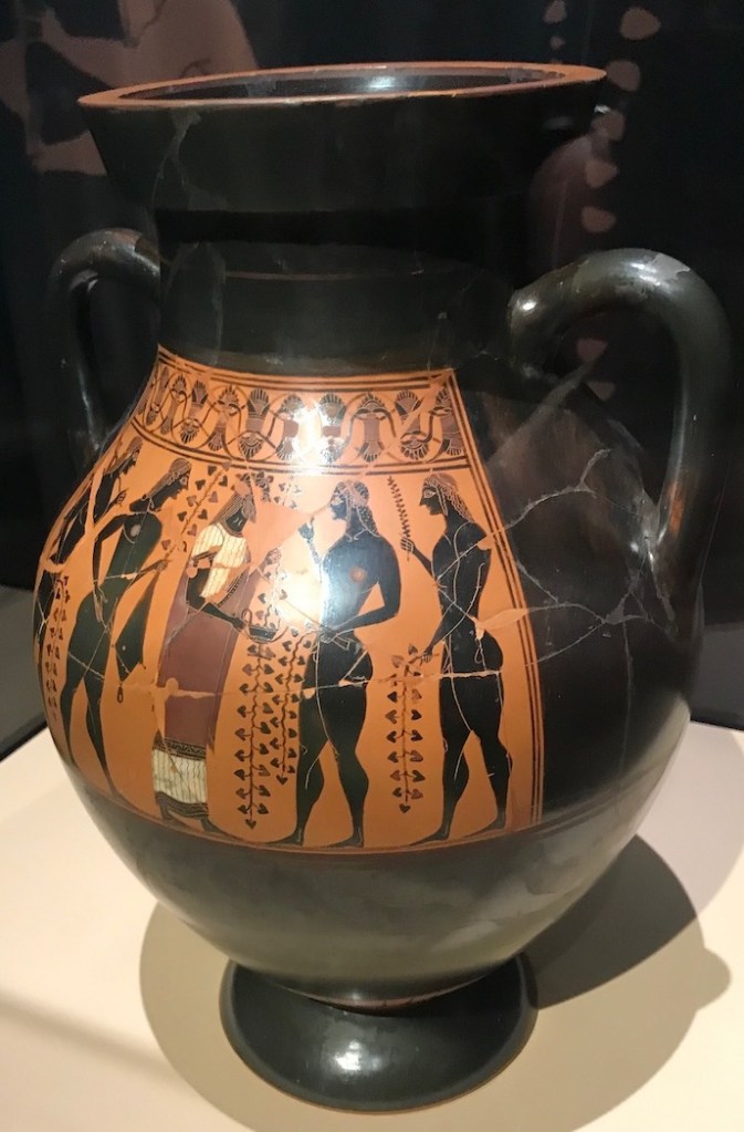 Dionysos, dieu errant, offrait la vigne et le vin à ceux qui l’accueillaient, comme sur cette amphore trouvée en Attique (-550 -530) où on le voit apportant du vin à des jeunes hommes porteurs de présents.