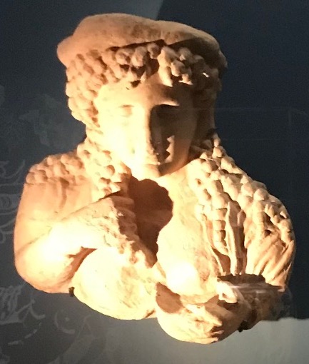 Voici maintenant deux masques représentant Dionysos sous deux formes très différentes : jeune homme pressant le raisin dans ses mains( Botrys -la grappe, à gauche) et vieillard barbu à cornes de taureau (Tauros). Asie Mineure, IIème-Ier siècle avant JC)