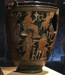 Voici encore Dionysos sur une « nestoris » (Italie du sud, vers -350) avec Eros (le vin passait pour être aphrodisiaque) : Dionysos est étendu sur un lit, face à un satyre, tandis qu’au dessus Eros tient dans ses mains un cerceau (filtre d’amour ?).
