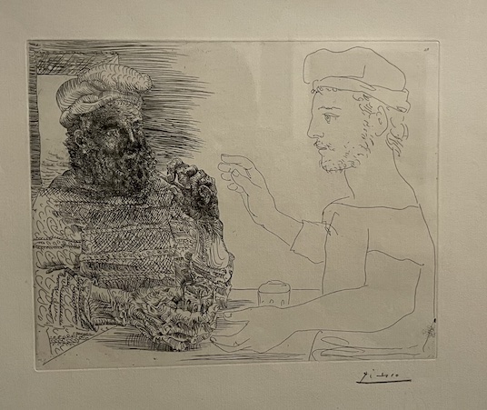 Cette eau-forte de Picasso, un émouvant « repas frugal », date de 1904. « Le vin des pauvres, chez Picasso, n’est pas avilissement. Il est revanche sur l’existence », dit le commentaire.