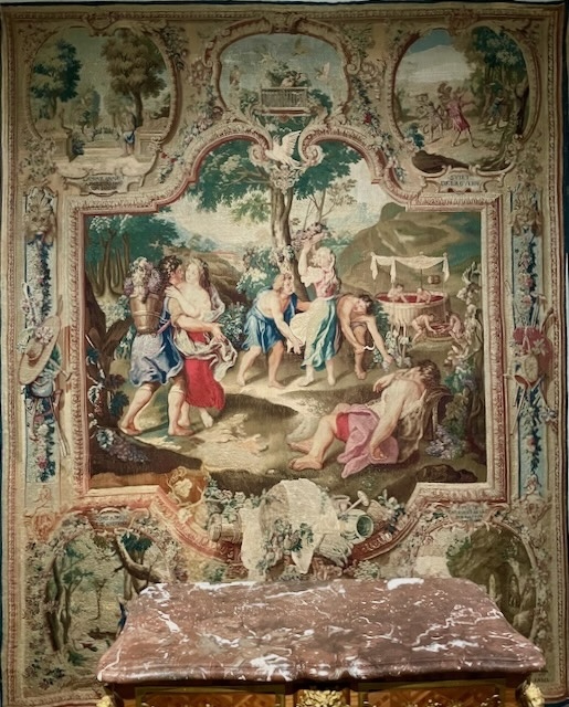 Initié à la peinture par Charles Coypel, le Régent dessine les cartons de tapisseries illustrant les amours de Daphnis et Chloé. Voici celle intitulée les Vendanges.