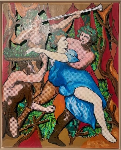 L’artiste clamartois utilise le carton pour supporter ses oeuvres, ce qui permet notamment des effets de volume, « avec des personnages au premier plan et un arrière-plan végétal ».
