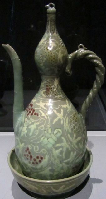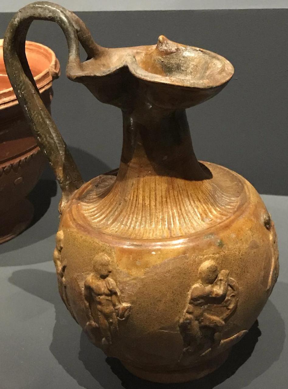 Cette cruche à vin représentant une noce paysanne vient de Wallonie (1600-10). Elle est en grès gris et étain.