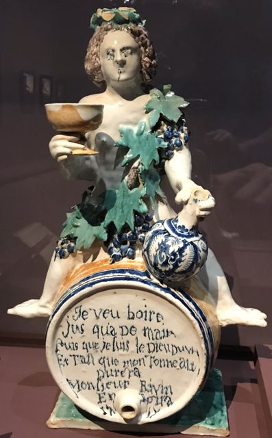 Le cavalier juché sur ce tonnelet de faïence nous dit en vers : « Je veux boire jusqu’à demain/ puisque je suis le dieu du vin/ et tant que mon tonneau durera/ monsieur Rivin en boira »