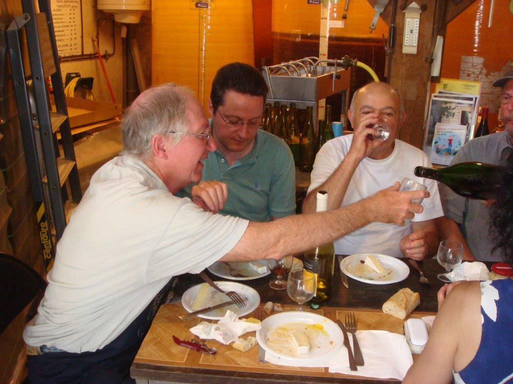 Pendant ce temps, tandis que les garçons de chais triaient, foulaient, pressaient, et faillaient en venir au main quand l’un voulut « shunter » le tri, le vice-grand-maître Marcel, véritable chef d’orchestre, pilotait avec doigté et efficacité les opérations, sachant être partout quand il fallait ; Dame Gisèle, préparait dans son verre les échantillons de jus à mesurer*, Dame Carmen faisait merveille à la lance à incendie, et Dame Ginette au tiroir-caisse notait tout et engrangeait les chèques. Et tous trinquaient.