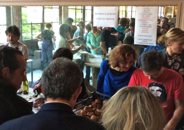 Armée de jetons à un euro permettant d’acquérir, qui une mouclade chez Thierry Faucher, qui une soupe au chou rouge chez Yves Cambedorde, et dix autres délectables petits plats, la foule se pressait de part et d’autre de la longue table : d’un côté vignerons, cuistots et leurs aides venus en nombre ; de l’autre les fans de Pigalle, mis en appétit par l’ambiance surchauffée et le sentiment de vivre un moment inoubliable.