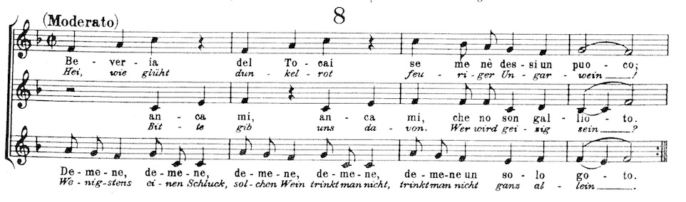 Trunken muessen wir alle sein! Jugend ist Trunkenheit ohne Wein; Trinkt sich das Alter wieder zu Jugend, So ist es wundervolle Tugend. Fuer Sorgen sorgt das liebe Leben Und Sorgenbrecher sind die Reben. Da wird nicht mehr nachgefragt, Wein ist ernstlich untersagt. Soll denn doch getrunken sein, Trinke nur vom besten Wein! Doppelt waerst du ein Ketzer In Verdammnis um den Kraetzer.