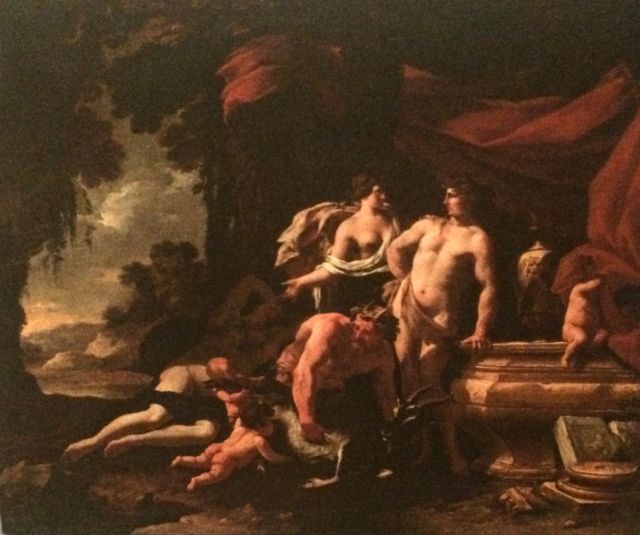 Elle ouvre un oeil mourant mais quel objet l’étonne ? Elle voit à ses genoux un dieu jeune et charmant que le pampre couronne. Il a la coupe en main les yeux brillants et doux.