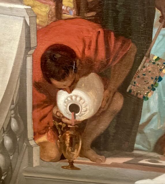 Il fait asseoir le laquais, le fait boire, et lui verse de nouveau du vin.