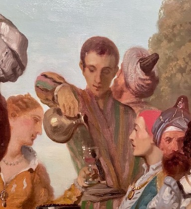 La maison de Victor Hugo présente actuellement une exposition Louis Boulanger, peintre ami du poète qui dessina les costumes de ses personnages, illustra ses œuvres etc. Nous y avons vu ce » festin à la mode vénitienne », grand panneau commandé pour la salle à manger de M. Malher 52, faubourg saint Honoré,
