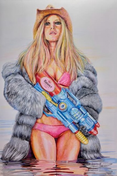 Poursuivons dans la même veine humoristique avec cette « flingueuse » de Sybil Aubin, « artiste-peintre designeuse ». BB aquatique et guerrière s’apprête à tout dézinguer au champagne !